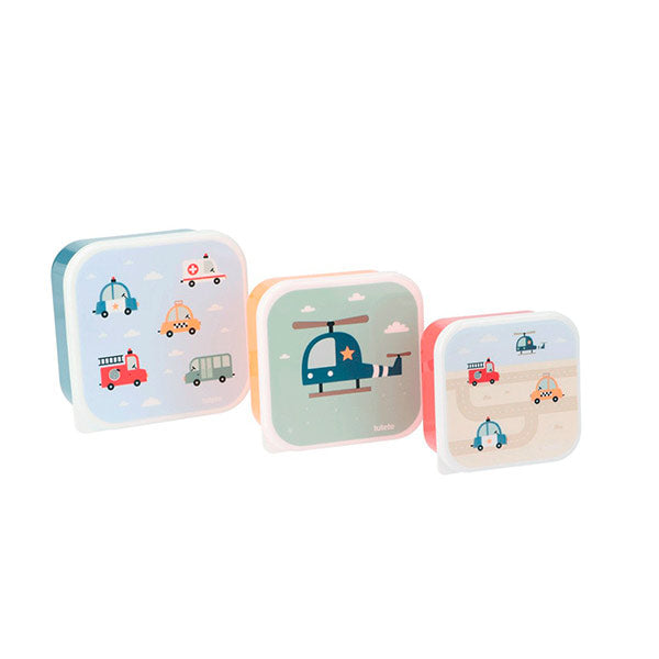 Las tres fiambreras se encajan entre sí para ahorrar espacio cuando no se usan. Son prácticas, ligeras y caben genial en la mochila. ¡Un básico escolar que encanta! Descubre la colección City Cars de Tutete.
