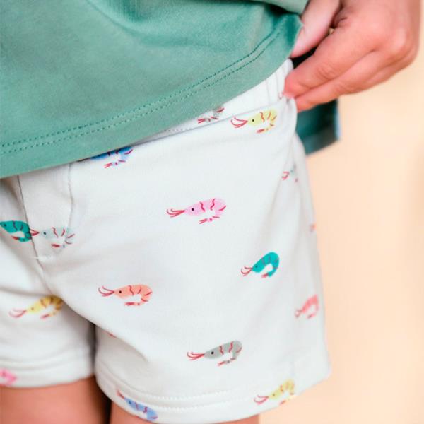 Bóxer de lycra con estampado de camarones de colores. Diseño exclusivo y propio. Detalle etiqueta de marca en la espalda. Tejido con protección contra rayos UVA con un certificado de factor 50 de protección UVA. Composición: 91% poliamida reciclada y 9% elastano.
