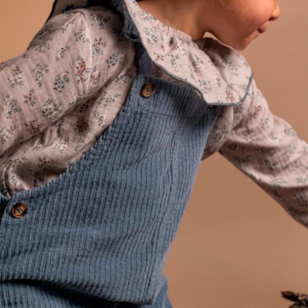 Blusa en muselina 100% algodón con estampado floral. Detalle de pespuntes de color en cuello y mangas. Pieza especialmente diseñada para favorecer la autonomía del niño.