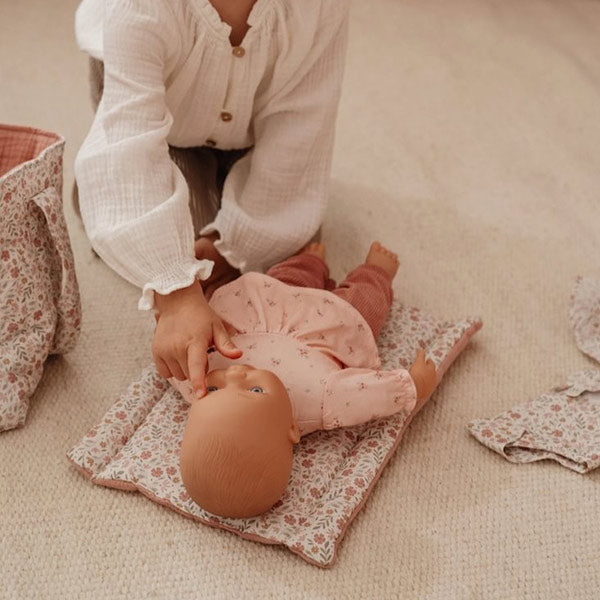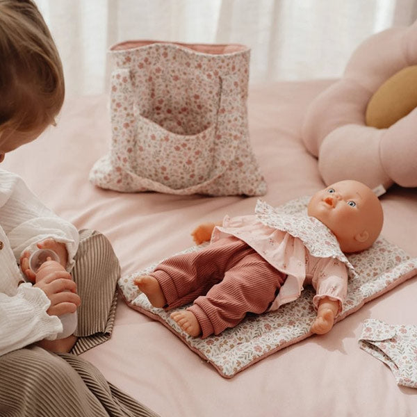 Incluye todo lo necesario para cuidar a sus muñecos bebé: pañal, cambiador y babero, con los preciosos estampados florales de Little Dutch. Ligero, práctico y lleno de ternura, este set de accesorios para muñecos invita a horas de juego imaginativo y momentos dulces en cualquier lugar.