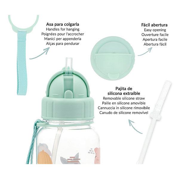 La pajita de silicona se despliega sola al abrir la tapa, haciendo que beber sea fácil y sin goteos. Además, esta botella de agua para niños tiene asa para colgarla cómodamente donde quieras.