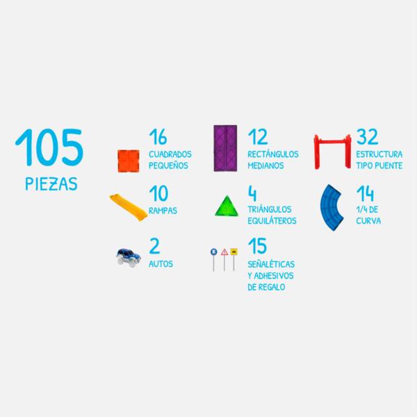 ¡Saca tu yo constructor con la serie Imanix Pista de Carreras! Estos bloques magnéticos harán que los niños se lo pasen en grande construyendo diferentes carreteras con desniveles para que circulen los coches especiales de carreras. Gracias a su sistema de imanes podrán conectar las piezas fácilmente y dar rienda suelta a su imaginación. Este pack contiene 105 piezas fabricadas en plástico no tóxico, entre ellos dos coches. Dentro de la serie Imanix existen diferentes modelos: toboganes, pista de carreras, trenes, classic… Descúbrelos todos en nuestra sección «Construcción».