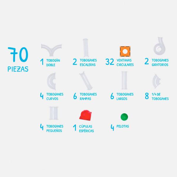 ¡Saca tu yo constructor con la serie Imanix! Estos bloques magnéticos harán que los niños se lo pasen en grande construyendo diferentes estructuras en 3D. Gracias a su sistema de imanes podrán conectar las piezas fácilmente y dar rienda suelta a su imaginación. Este pack 70 piezas fabricadas en plástico no tóxico tiene la particularidad de incluir toboganes para que las bolas recorran un súper circuito ideado por cada niño. Incluye 1 tobogán doble, 2 toboganes escaleras, 32 ventanas circulares, 2 toboganes giratorios, 4 toboganes curvos, 6 toboganes rampas, 6 toboganes largos, 8 cuartos de tobogán, 4 toboganes pequeños, 1 cúpula esférica, 4 imaballs. Dentro de la serie Imanix existen diferentes modelos: toboganes, pista de carreras, trenes, classic.. Descúbrelos todos en nuestra sección «Construcción».