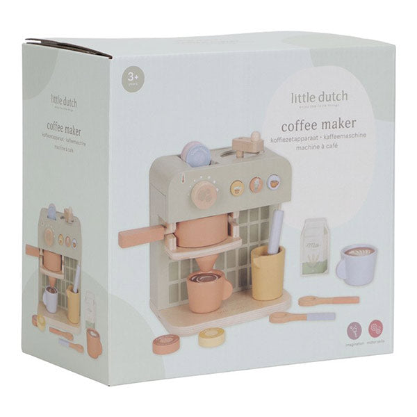 La Cafetera Grande Little Dutch convierte a los peques en auténticos baristas a través del juego simbólico. Con tazas, cápsulas, jarra de leche y divertidas plantillas, podrán preparar cafés y tés como los mayores.