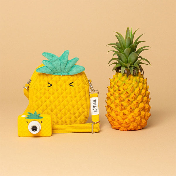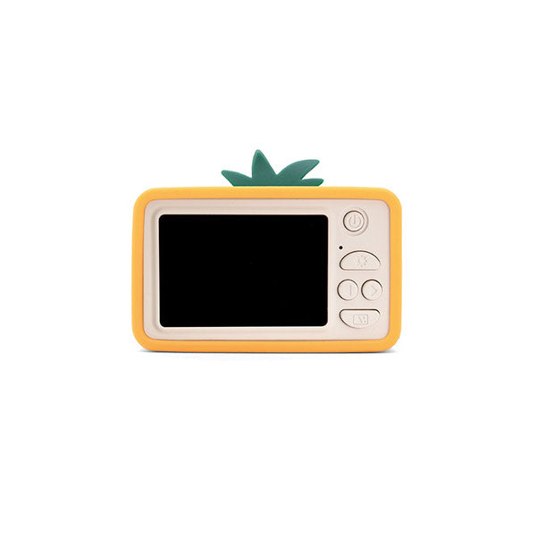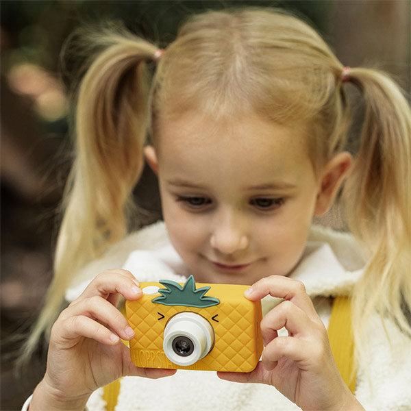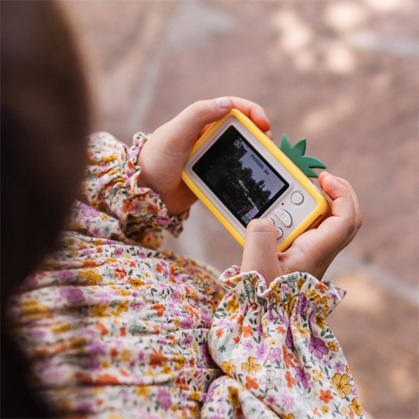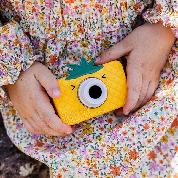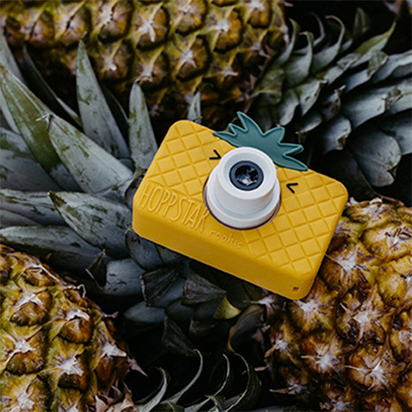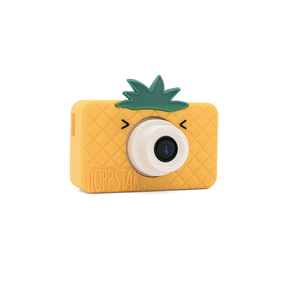 La Cámara Hoppstar Rookie Piña Colada impresiona por su atractivo diseño. Sus botones grandes la hacen especialmente fácil de usar. La funda de silicona extraíble ofrece protección contra roturas y, al mismo tiempo, un agarre perfecto para sujetar y manejar la cámara fácilmente.