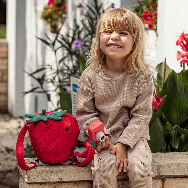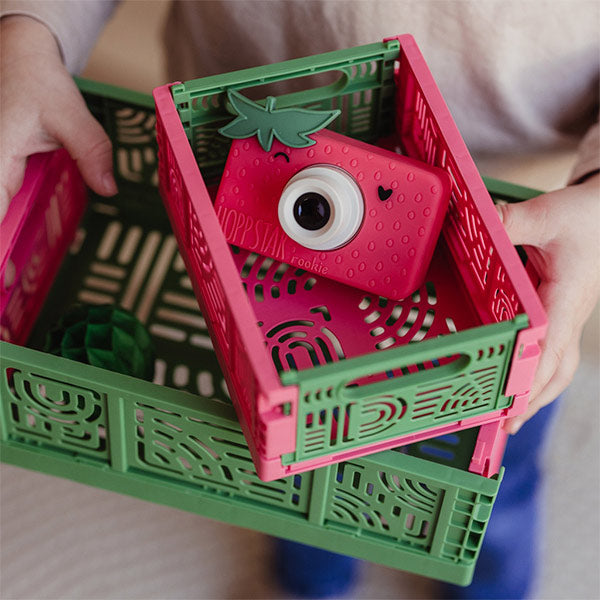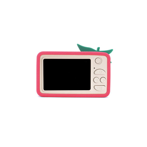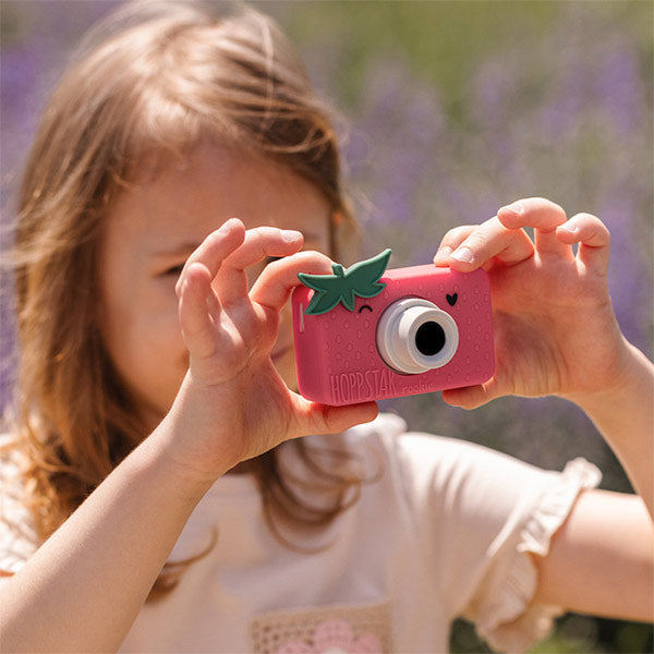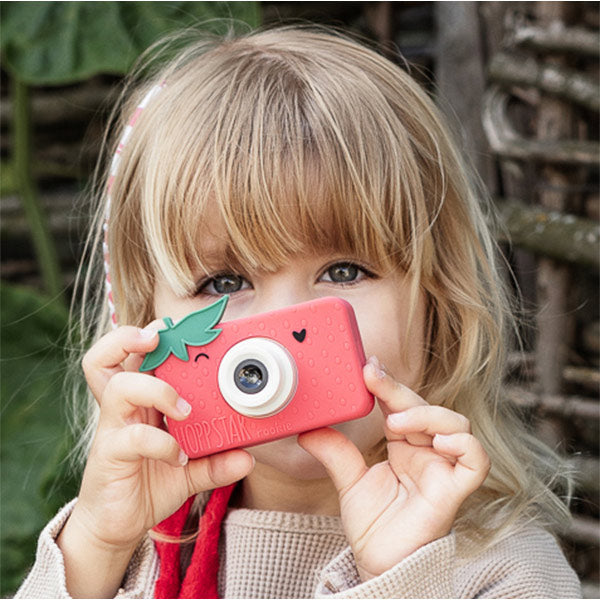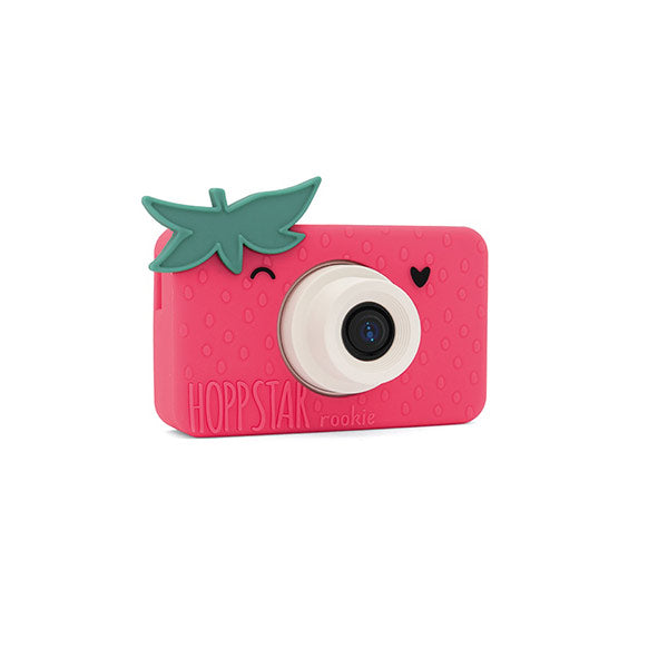 La Cámara Hoppstar Rookie Strawbella impresiona por su atractivo diseño. Sus botones grandes la hacen especialmente fácil de usar. La funda de silicona extraíble ofrece protección contra roturas y, al mismo tiempo, un agarre perfecto para sujetar y manejar la cámara fácilmente.