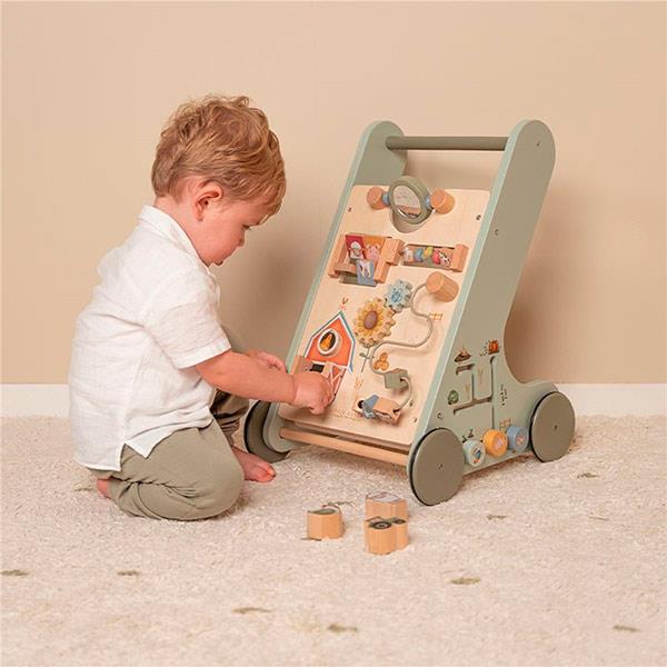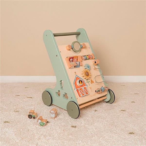 ¡Camina, juega y aprende! Esta caminador de madera ofrece diversas actividades desafiantes, que apoyan el desarrollo y las habilidades motoras del niño. Desafía a tu bebé con las actividades de este bonito andador decorado. Hay 8 actividades para descubrir y dominar. Con su diseño robusto, el andador es apto para niños de 12 meses y mayores que están listos para sus primeros pasos. Las ruedas de goma aseguran que el suelo de casa no sufra con rayones y suciedad.