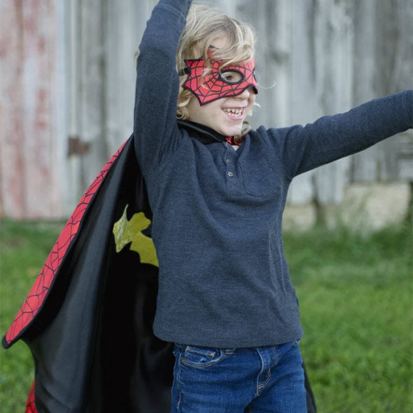 🦸 Esta capa y máscara reversible convierte a los peques en héroes al instante. Con un solo gesto pasan de murciélago a hombre araña, fomentando la imaginación y el juego simbólico con disfraces infantiles, capas para niños y la calidad de Great Pretenders.