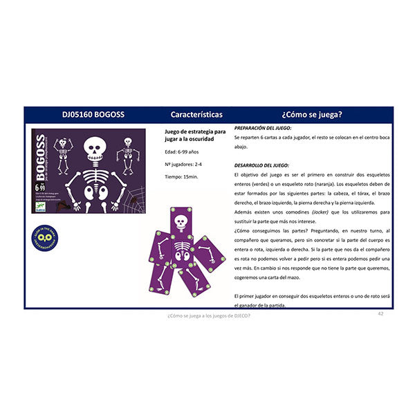 💀 ¡Diversión brillante con las Cartas Bogoos Djeco! Este juego de cartas para niños invita a formar esqueletos pidiendo las piezas correctas… ¡pero cuidado con los huesos rotos! 💫 Parte de los juegos educativos Djeco, desarrolla la estrategia, la observación y la memoria. Y lo mejor: ¡brillan en la oscuridad! 🌙