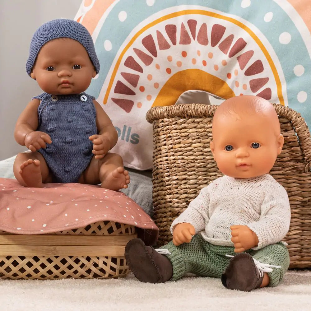 Pelele y gorro de punto para muñecas y muñecos de 32cm. La nueva colección de ropita de punto para muñecos Miniland Dolls, está fabricada con materiales reciclados. Todos ellos en tonalidades naturales y con un aire “handmade”. Los muñecos Miniland no sólo son excelentes compañeros de juego, sino que también promueven valores fundamentales como la igualdad y el respeto hacia los demás.