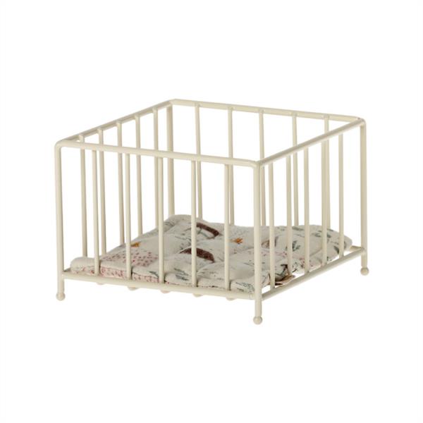 Este encantador corralito se adapta perfectamente a todos los amigos en tamaño mini. Es de metal y está pintado en un suave tono blanquecino. En la parte inferior hay un colchón suave cubierto con tela única de Maileg.