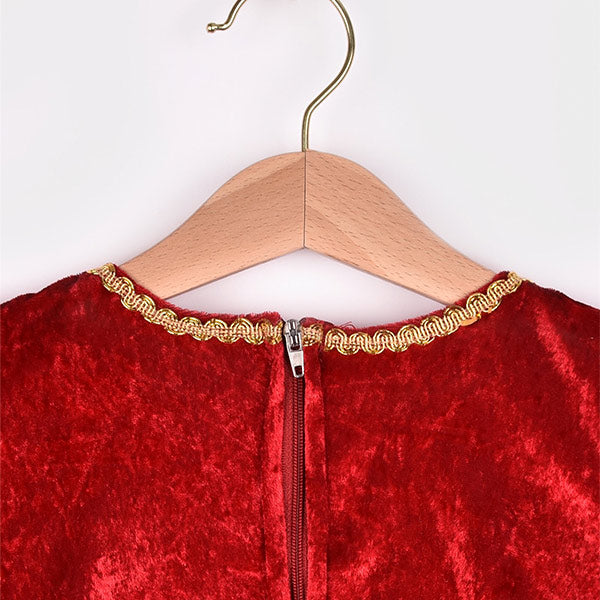 Vestido largo en terciopelo rojo, con panel central claro decorativo, mangas cortas abullonadas, detalles dorados y cierre de cremallera trasera. Tejido suave y fluido.