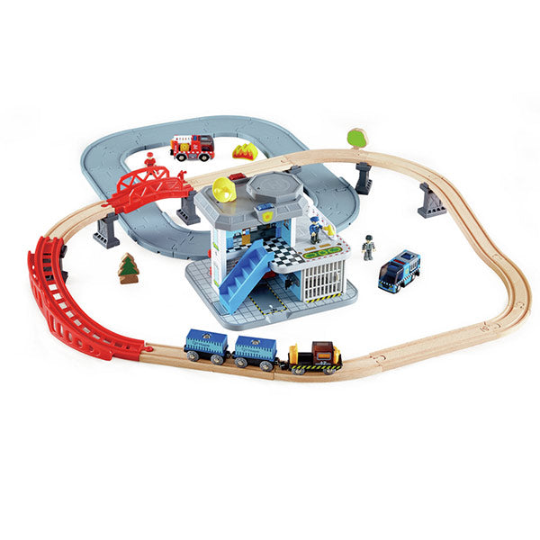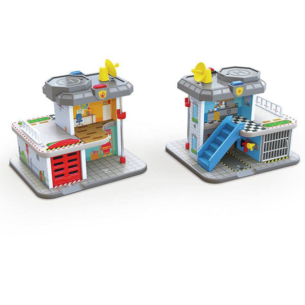 🚨 ¡Diversión y acción garantizadas! La Estación General de Servicios de Emergencia Hape protege carreteras y vías ferroviarias con sus increíbles vehículos de juguete y su estación 2 en 1 de policía y bomberos.