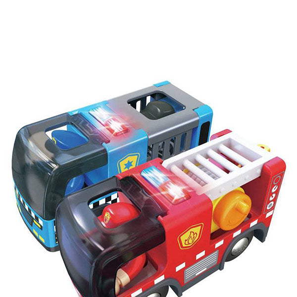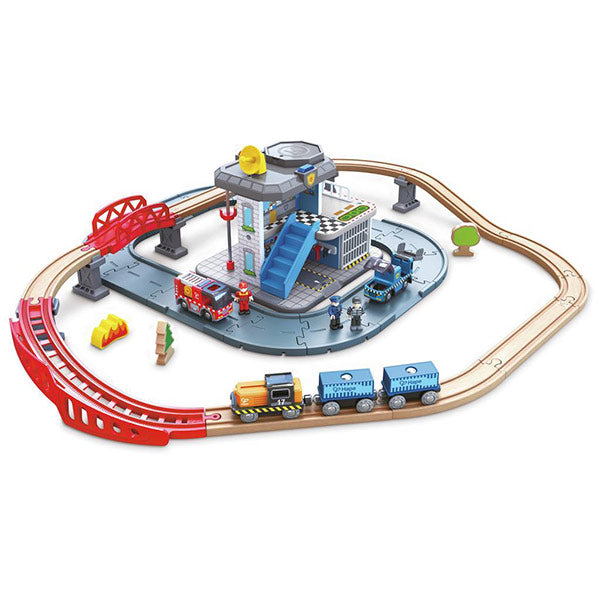 Con sirenas, luces y caminos de plástico vegetal sostenible, este set estimula la imaginación, el juego de rol y la coordinación. Además, es compatible con trenes de juguete, ampliando la aventura sin límites. ¡Los héroes de la ciudad están listos para actuar con Hape!