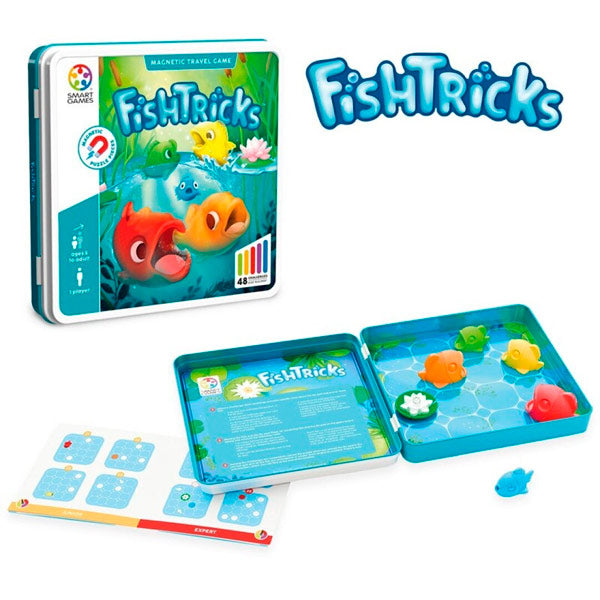 FishTricks de SmartGames es un divertido juego de lógica ideal como juego para ir de viaje. Coloca los peces de mayor a menor en orden correcto sobre el nenúfar y resuelve cada desafío. Perfecto para estimular la mente de los peques mientras se entretienen en cualquier lugar.