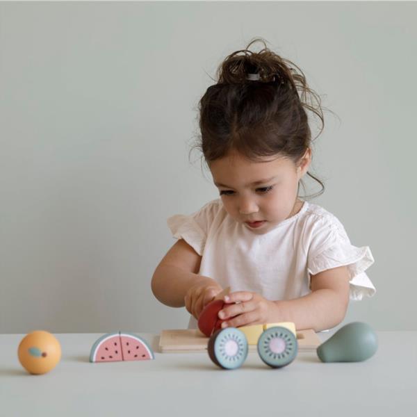 ¡Come fruta todos los días! A tu hijo le encantará imitar la preparación de una variedad de frutas con este bonito juego de madera de Little Dutch con seis frutas diferentes. Viene con una tabla de cortar y un cuchillo de madera para dividir las frutas por la mitad. ¿Cuál es tu fruta favorita? ¿Manzana, plátano, kiwi, pera, naranja o una rodaja de sandía? Todas las frutas se unen fácilmente con velcro y volvemos a cortarlas con el cuchillo de madera. Entretiene y desarrollo la motricidad fina , la imaginación y la creatividad . Edad recomendada +2 años.