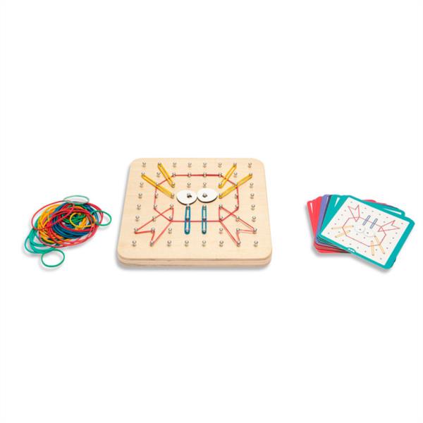 Con este tablero de puntitos podrás hacer las creaciones más bonitas. La base de madera contiene 64 posiciones donde poner cada segmento de las gomas de tal manera que los pequeños pueden crear sus patrones o criaturas. El juego incluye tarjetas con ejemplos para que los pequeños se inicien y continúen sus creaciones. Este juego educativo es ideal para que los niños desarrollen habilidades como la motricidad fina al colocar las gomas y ganar fuerza y precisión con manos y dedos. ¡Deja que vuele su imaginación!