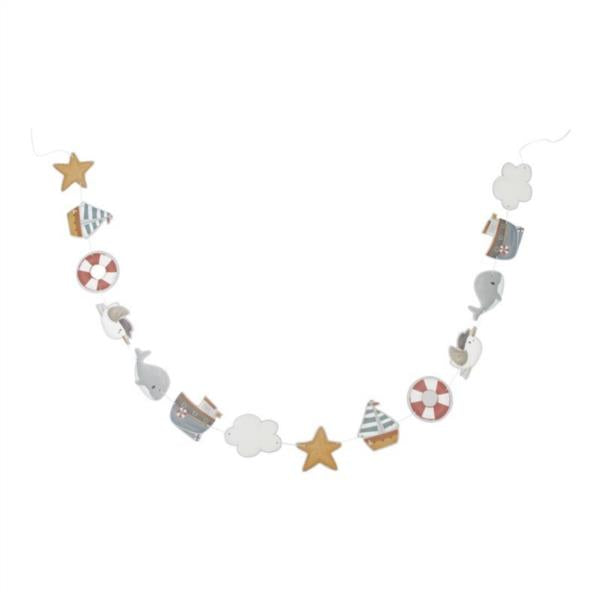 ¡Mira todos esos encantadores personajes de Sailors Bay! Sigue la fila de veleros, gaviotas y ballenas en esta guirnalda náutica. ¿Qué aventuras les esperan? Esta guirnalda de Little Dutch con adornos de cartón despertará la imaginación de tu pequeño cuando le cuente cuentos antes de dormir sobre la vida en el mar. Cuélgalo en la pared o en una estantería para añadir un toque a la habitación del bebé . Combínalo con otros artículos de la colección, como los doudous o el cubo blandito de actividades Sailors Bay.