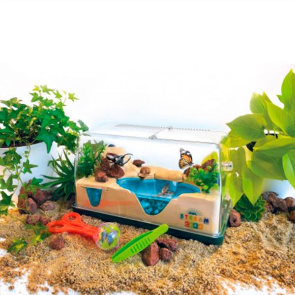 Incluye atrapainsectos , pinzas, hábitat con tapa de transparente, charca para el agua, manual de instrucciones.
