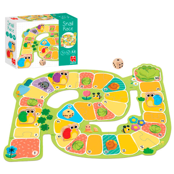 El juego Carrera de Caracoles Goula es un divertido juego de mesa para niños pequeños donde los caracoles avanzan por el tablero mientras los jugadores descubren quién llegará primero a la meta.