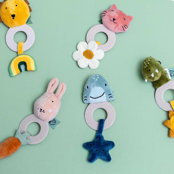 Grueso y masticable, este simpático juguete mordedor para bebés de Trixie es perfecto para aliviar las encías de tu bebé y alegrarle el día. Con su carita de peluche, su aro mordedor de silicona y sus accesorios de sonidos crujientes al tacto, tu bebé no soltará este colorido juguete donde quiera que vaya.