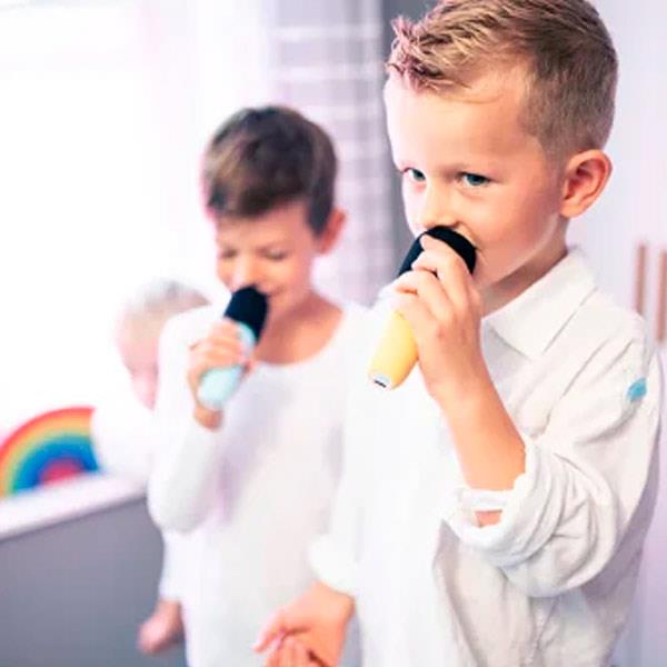 Características Medidas altavoz: 5.7 cm de diámetro Medidas micrófono: 13.58 cm alto x 3.77 cm de diámetro Medidas Packaging: 9 x 7.5 x 6.5 cm Altavoz con asa extraíble Micrófono con tapa de espuma extraíble El micrófono cuenta con botones para controlar la música mientras cantas Cable de carga micrófono y altavoz USB a USC Conexión inalámbrica Bluetooth 5.0 Ranura para tarjeta de memoria (máximo 32 GB), no incluida Potencia altavoz: 4 ohmios, 6 W Frecuencia: 20 Hz – 20 kHz Efecto de eco Alcance altavoz aproximado: 10 metros Mini conector de 3.5 mm para auriculares Aux (no incluido) Fuente de alimentación: CC 5V 1A Batería altavoz de 1800mAh Batería micrófono de 1200 mAh Tiempo aproximado de carga altavoz: 2 horas Tiempo de carga micrófono: 2 a 4 horas A partir de 3 años