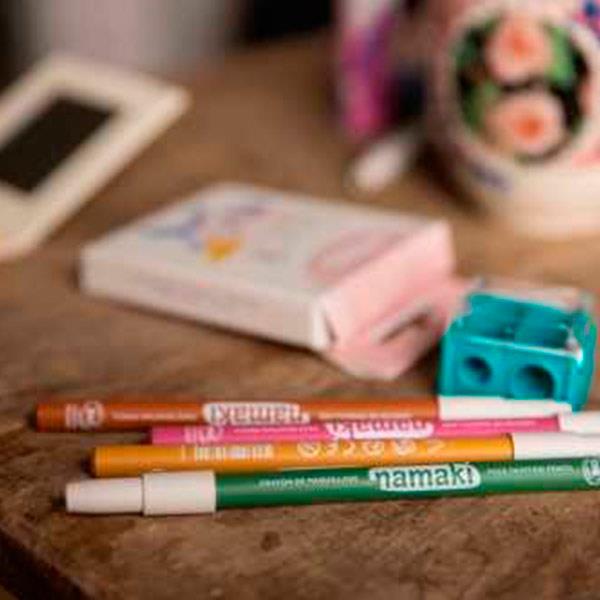 Lápiz fino de maquillaje de Namaki con el que decorar la cara y el cuerpo de los peques para sus fiestas de disfraces preferidas. Namaki es una marca que nació con la idea de crear un maquillaje que respete la piel de los niños y el medio ambiente, dermatológicamente probados y no testados en animales.