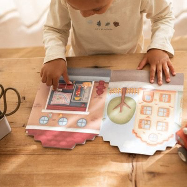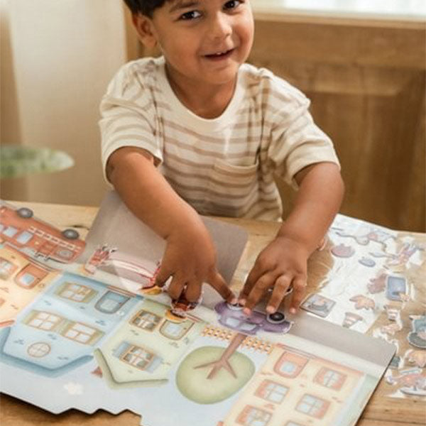 Libro de pegatinas reusables, cada librito contiene 3 hojas de pegatinas, crea tu propia historia inspirado en la estación de bomberos del muñeco Jim . Perfecto para jugar en casa y para llevar.
