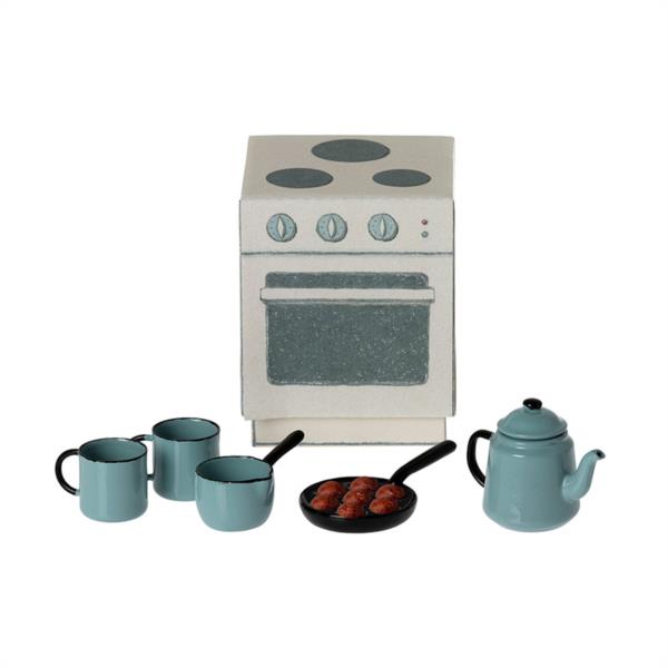 Un juego de cocina en miniatura con todos los favoritos de Madam blue. Una linda lata de café, dos tazas, una cacerola y una sartén con deliciosos pasteles de hojaldre. Todas estas piezas vienen en una caja de papel, diseñadas a modo de estufa. Edad recomendada +3 años