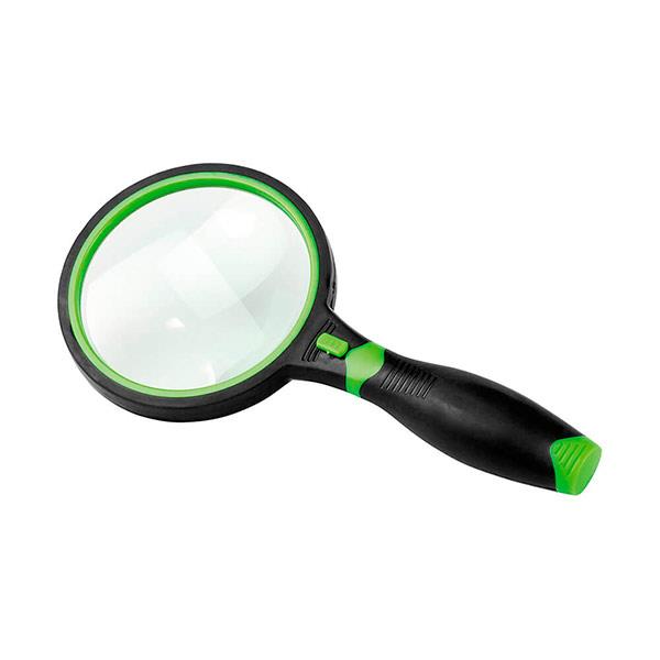 Práctica y robusta Lupa con luz integrada. Descubre la naturaleza mucho más cerca e investiga colores, formas y anatomía de sus habitantes. Superficie de goma para un agarre seguro. Lente de 4 aumentos. Baterías incluidas reemplazables (3 x LR44).