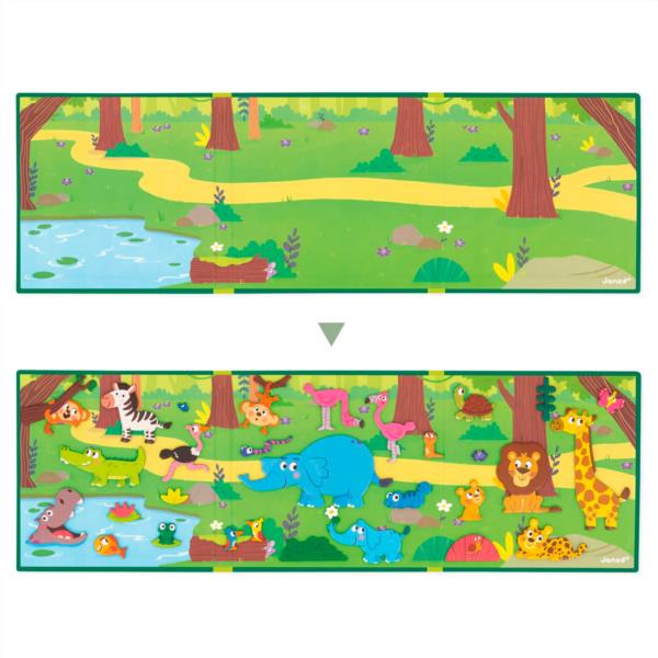 ¡Llegan las historias magnéticas! La jungla te espera con todos sus protagonistas, el león, el elefante la cebra y muchos más… con los imanes de este Magneti Stories de la marca Janod. Diversión dentro de casa y fuera, además de ser perfecto para llevarlo de viaje a cualquier lado. Este juego magnético fomenta el desarrollo del lenguaje y el habla al imaginar historias con los personajes, la coordinación ojo mano y la motricidad al usar las piezas magnéticas con sus manitas, y ¡la imaginación por supuesto!