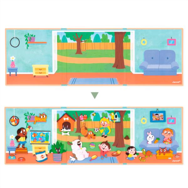 ¡Llegan las historias magnéticas! Descubre la vida de los animales domésticos en una bonita casa con los imanes de este Magneti Stories de la marca Janod. ¿Qué hará el gato? ¿y el perro? Diversión dentro de casa y fuera, además de ser perfecto para llevarlo de viaje a cualquier lado. Este juego magnético fomenta el desarrollo del lenguaje y el habla al imaginar historias con los personajes, la coordinación ojo mano y la motricidad al usar las piezas magnéticas con sus manitas, y ¡la imaginación por supuesto! Edad recomendada de 3 a 8 años