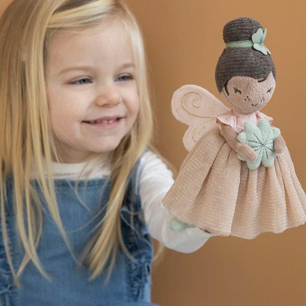 Esta pequeña hada trae buena suerte, con su polvo de hadas que rocía felicidad y sonrisas a tu alrededor. Desde un mundo mágico muy lejano el hada Ella viene a tu casa para traerte suerte con su trébol de cuatro hojas. Ella será tu mejor amiga y te cuidará siempre y en todas partes. Con su vestido rosa, su cabello castaño en un moño, sus alas de hilo dorado y sus zapatos de bailarina, Ella les encantará a todos los niños para jugar y divertirse.