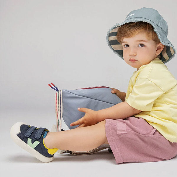 Zapatillas deportivas multicolor barefoot para niños fabricadas en lona. V de victoria lateral y pieza trasera en colores efecto piel. Forro interior a juego con la talonera. Cierre de tiras adherentes que aportan mayor sujección y facilitan el calce, fomentando su autonomía. Suela blanca de TPR con refuerzo en la puntera para una mayor resistencia y durabilidad.