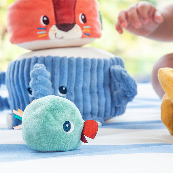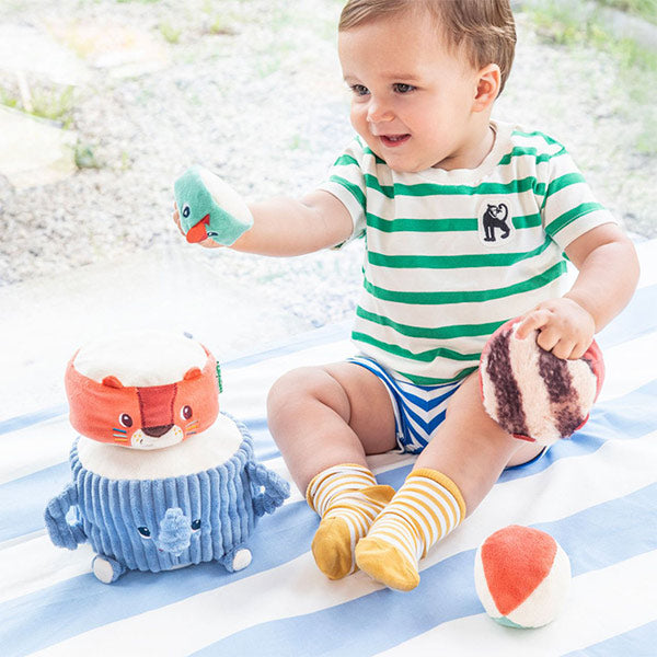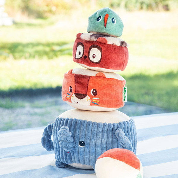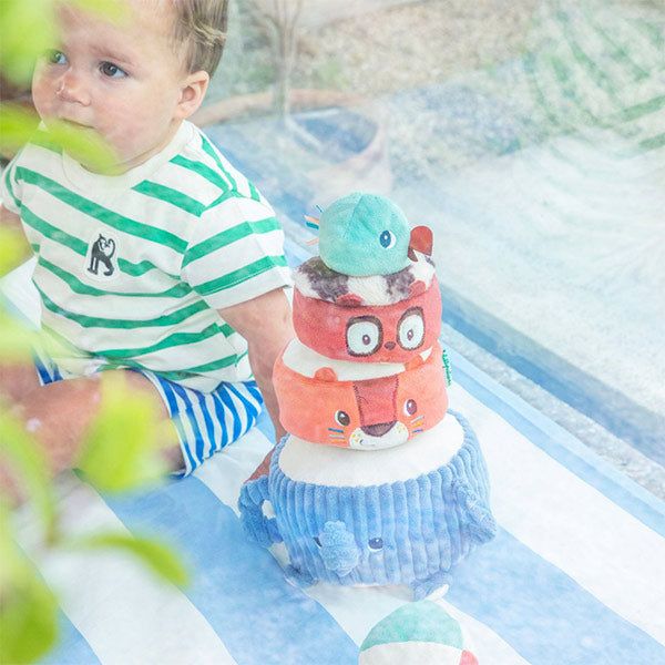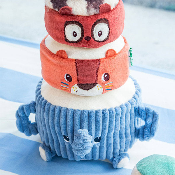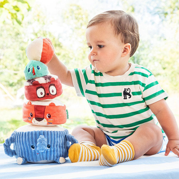Albert el elefante y sus amigos invitan al bebé a apilar, descubrir sonidos y reír sin parar 🐘. Esta torre blandita estimula los sentidos mientras construyen y hacen tambalear la pirámide.