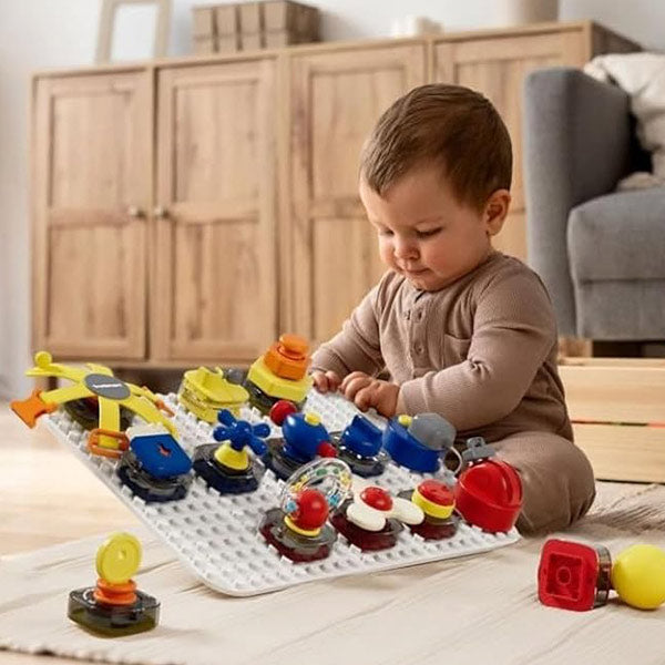 Cada elemento de la Pizarra Actividades Deluxe Set TopBright propone un reto diferente: desde cerraduras hasta una bocina para tocar, pasando por botones que presionar o girar. Hay mucho que agarrar, manipular y explorar, estimulando la curiosidad del niño.