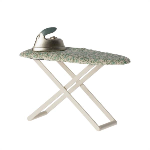 Para que el cuarto de lavar esté completamente equipado debes tener una plancha y tabla de planchar, esto es la diversión más autentica. La tabla de planchar es de metal y está cubierta con una tela única de Maileg. Perfecta para la familia de ratones.