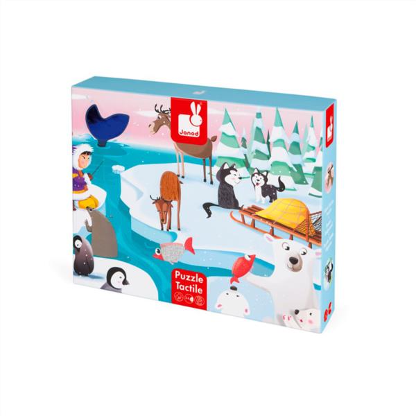 Descubre la vida en el ártico con este puzle gigante táctil de la marca Janod. El puzle táctil para niños es una versión especial de rompecabezas diseñada para estimular el sentido del tacto de los más pequeños mientras juegan. A diferencia de los rompecabezas tradicionales, este tipo de puzle tiene piezas con diferentes texturas y sensaciones táctiles.