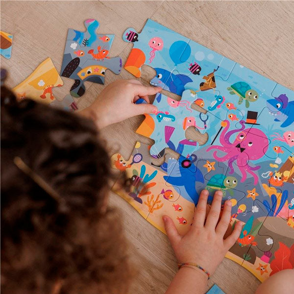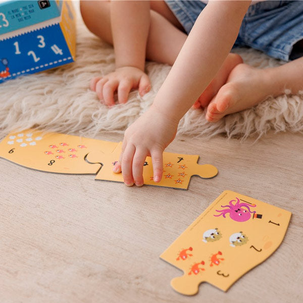 Este colorido puzzle para niños con temática marina es mucho más que un juego. Una vez montado, comienza la aventura: los peques contarán del 1 al 9 y buscarán en la imagen los animales marinos correspondientes. Un divertido puzzle educativo que les ayuda a reconocer símbolos numéricos y asociarlos con cantidades. Ideal como uno de esos juegos didácticos que combinan aprendizaje y entretenimiento en un solo gesto.