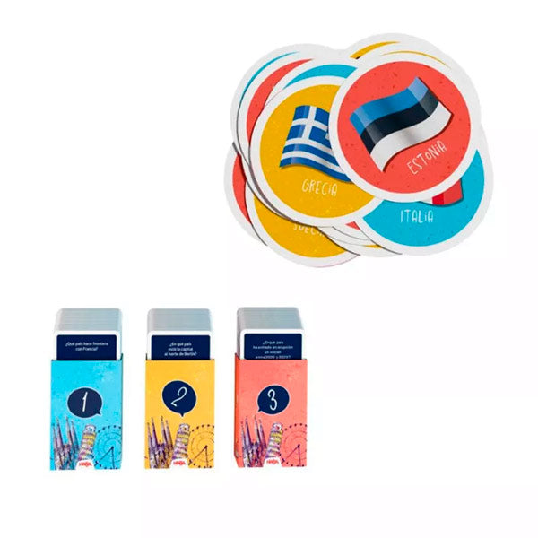 - Contiene 3 mazos de 60 cartas (180 cartas), 21 tarjetas de países, 50 fichas e instrucciones.