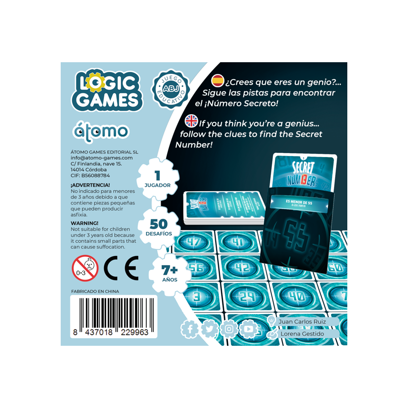 Descubre Secret Number de la firma de juegos educativos Átomo. Baraja los retos, mételo dentro del sobre. Encuentra el número secreto a través de los números que quedan encima de la mesa. Juego para fomentar el pensamiento lógico-matemático. Un Quién es Quién con números.