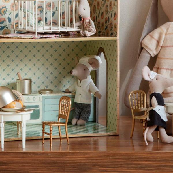 Una silla de tamaño perfecto para la familia de ratones. Está fabricado en metal con un acabado dorado y cuenta con los detalles más bonitos. Esta silla encaja con todas las mesas en tamaño ratón.