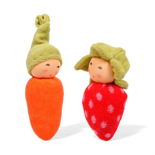 Este alegre y afrutado juguete de algodón ecológico de Nanchen hace sonreír a los niños. Los juguetes de agarre desempeñan un papel muy especial en los primeros meses de vida. El bebé aprende a percibir su entorno y se lleva todo a la boca para experimentarlo. El juguete de agarre tiene un tamaño ideal para las manos de los niños pequeños. El sonajero que hay dentro del muñeco de tela anima a los pequeños a agitarlo y fomenta así la coordinación mano-ojo. Los juguetes ecológicos de Nanchen no sólo están libres de sustancias nocivas, sino que también se producen de forma ecológica y justa. Se fabrican a mano con mucho cariño en una pequeña fábrica del norte de Hesse y las caras están pintadas a mano. Este simpático juguete de agarre «Zanahoria» es un compañero ideal en la cuna, en el cochecito o cuando se viaja en coche. Los sonajeros ayudan al bebé a explorar distintos sonidos, contribuyendo al desarrollo de los sentidos, la comprensión de la causa efecto y la motricidad fina.