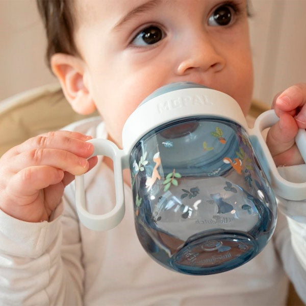 El vaso de aprendizaje Little Dutch de la colección MIO de Mepal está diseñado para que los más pequeños aprendan a beber solos, sin derrames. Cuenta con asas laterales que facilitan el agarre y una boquilla corta con doble abertura, pensada para cuidar la salud bucal y dental del bebé.